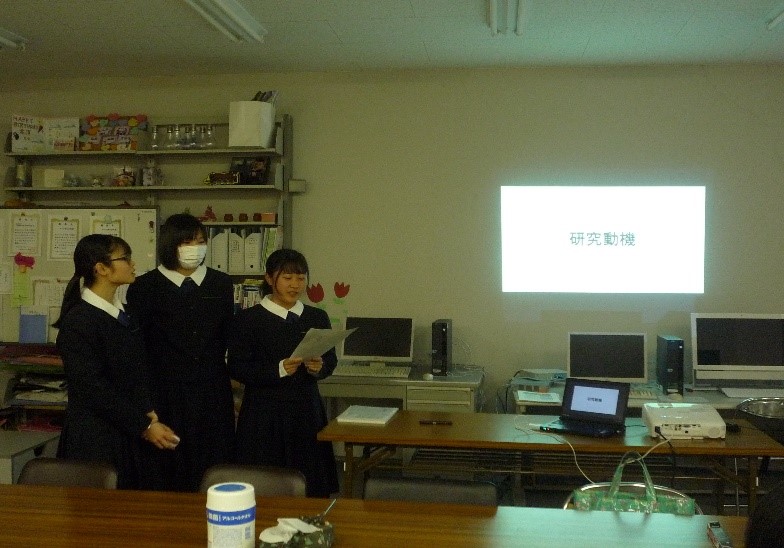 12月14日(金)は、5人の生徒が先行研究で調べたことをもとに「暴力性が高い人ほどDVをする確率が高いのか」など、9項目の質問を準備して来られました。当日は、発達心理学研究室に所属し、デートDVを研究のテーマとしていた河原美帆さんは「デートDVの規定要因-共感性、葛藤解決方略スキルおよび怒りの制御の影響-」について、坂本茉里恵さんは「大学生の過去の暴力経験がデートDVに及ぼす影響」について、佐藤隆治さんは「関係性および共感性とデートDVの暴力観との関連―大学生を対象としてー」について、自身の研究を高校生に紹介しました。これらの学生3名が高校生の質問に答えたり高校生に質問したりするなど、高校生と大学生との研究交流も行われました。