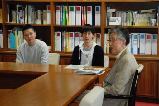 <学長に報告する佐藤隆治さんと西國進也さん>