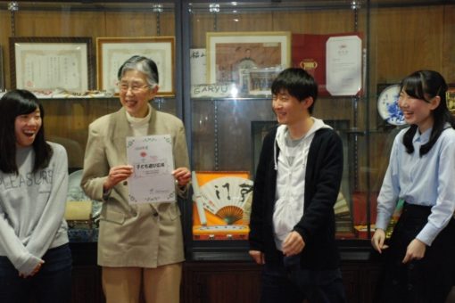 その後、各メンバーが「子どもに楽しんでもらえる遊びを企画することが難しかった(原奈穂さん)」、「子育てをしている親への理解が深まった(宮宗佳代さん)」、「季節に合せた活動を考えるのが楽しかった(安原涼子さん)」、「一年間を通して、参加する子どもの成長する姿に驚かされた(塩崎美緒さん)」など、「子ども遊び広場」での活動で担当したこと、得られたことなどを学長に報告しました。