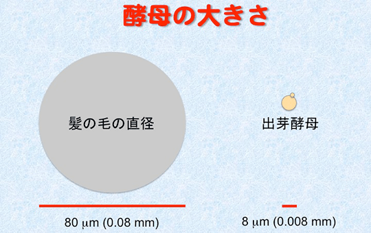 酵母は真核生物の仲間で、その大きさはヒトの髪の毛の直径の10分の1くらいしかありません。もちろん、肉眼では見えないのですが、顕微鏡を使うと芽を出して増殖する様子が観察されます。