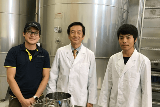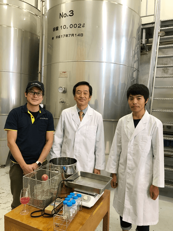 昨年(2018年)の9月28日に、「せらワイナリー」で赤ワインの仕込みを行いました。ブドウは世羅町産のマスカット・ベーリーAで、酵母は福山大学で開発されたバラ酵母1株とブドウ酵母3株です。いずれも発酵食品の製造によく用いられるサッカロマイセス・セレビシエという酵母の仲間です。下の写真は、仕込みを行ったタンクの前で撮ったもので、左から順に「せらワイナリー」の行安醸造長と久冨教授と当時4年生だった猪塚くんです。