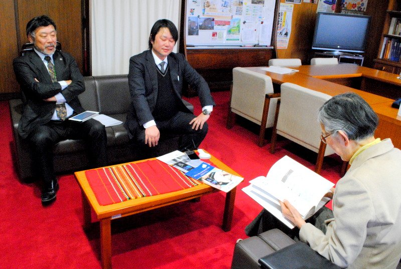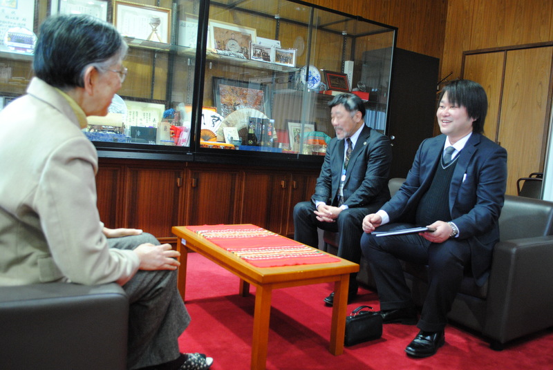 松田学長,嘗ての指導教員の香川工学部長,溝上氏 学長室での懇談の様子です。学生時代の武勇伝に思わず(笑)です。