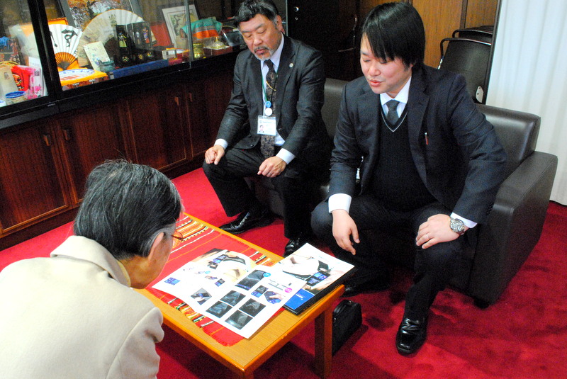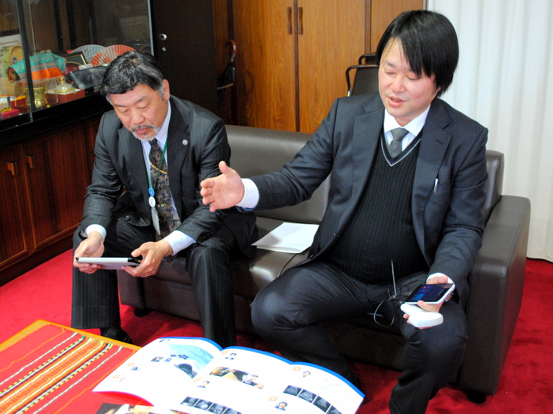 今回は、昨年末に完成し、12月19日に報道発表されたばかりの、小型超音波診断装置WiZに松田学長が興味を持ったことがきっかけで、実物を手に来学してくださいました。学長室の訪問には、学生時代の研究室の指導教員の香川工学部長も同伴し、溝上氏の福山大学在学中の懐かしい思い出だけでなく、入学早々の武勇伝(?!)なども飛び出しながら、終始なごやかな懇談となりました。