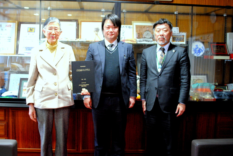 松田学長、溝上氏、香川工学部長で、学位論文と共に記念撮影しました