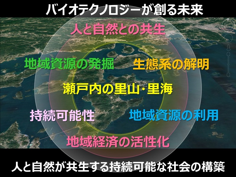 バイオテクノロジーは、生き物の未知の可能性を引き出し利用することで、付加価値の高い食品を生み出したり産業に有用な物質を見つけたり、またはDNAを分析するツールとなるなど、様々な方面で活躍しています。生物工学科のテーマは「瀬戸内の里山からはじまる食と環境のバイオサイエンス」です。瀬戸内の豊かな自然環境を舞台にバイオテクノロジーの可能性を追い求めています。