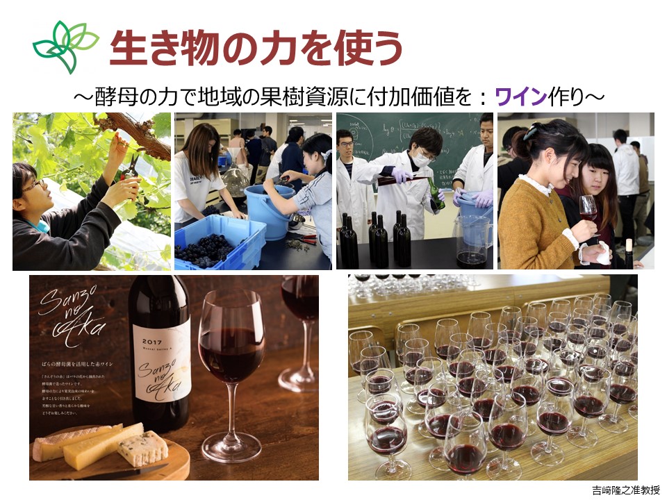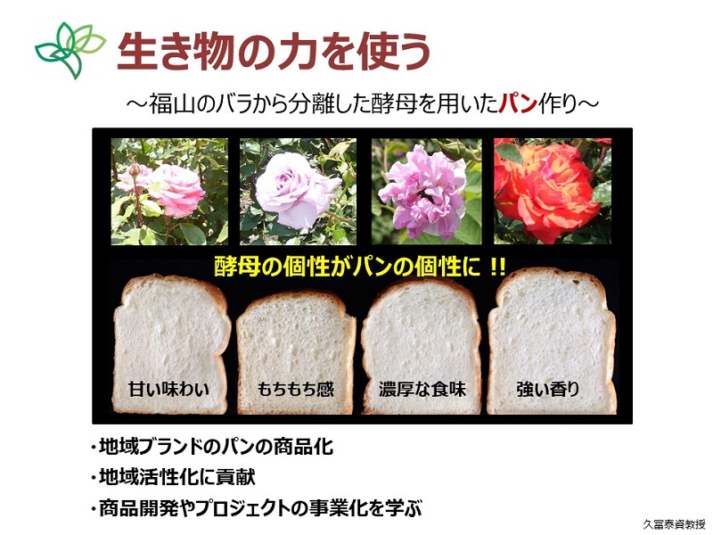 バイオテクノロジーの教科書で最初に出てくるのは、ワインやビール、パンなどの発酵です。その昔、人々は食料の保存のために微生物の発酵の働きに気が付き、それを利用してきました。生物工学科でも、福山市のシンボルであるバラから採取した酵母の発酵能を利用し、地域オリジナルのパンやワインの開発を進めています。生き物の力を利用して、魅力ある地域の特産品をつくりたいのです。