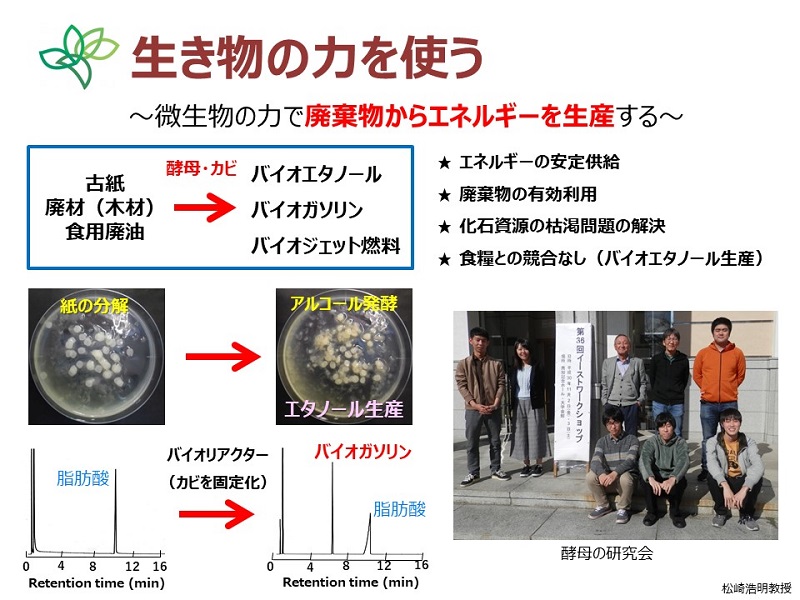微生物の力は食品のみならず、様々な産業に役立つ可能性を持っています。再生可能エネルギーの生産は古くて新しい研究分野です。生物工学科でも、いらなくなった廃棄物を利用してバイオ燃料をつくる研究を進めています。