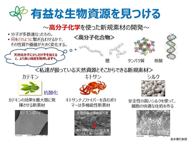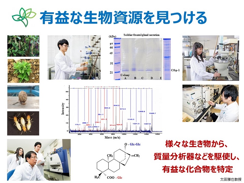 ちょっと周りを見てみましょう。記録されている生き物だけでも、地球上には180万種もいると言われています。そんな生き物が作る化合物の中には、医療、環境、食、その他の産業など人の社会に役に立つ有益な化合物がたくさんあるに違いありません。たとえば、カニの甲羅に含まれるキトサンナノファイバーという物質を利用することで人工の骨を作ることに役立てようとしたり、ヨウシュヤマゴボウから界面活性剤となる化合物を取り出して、有害なダイオキシンを自然環境から除去するために役立てようとしています。