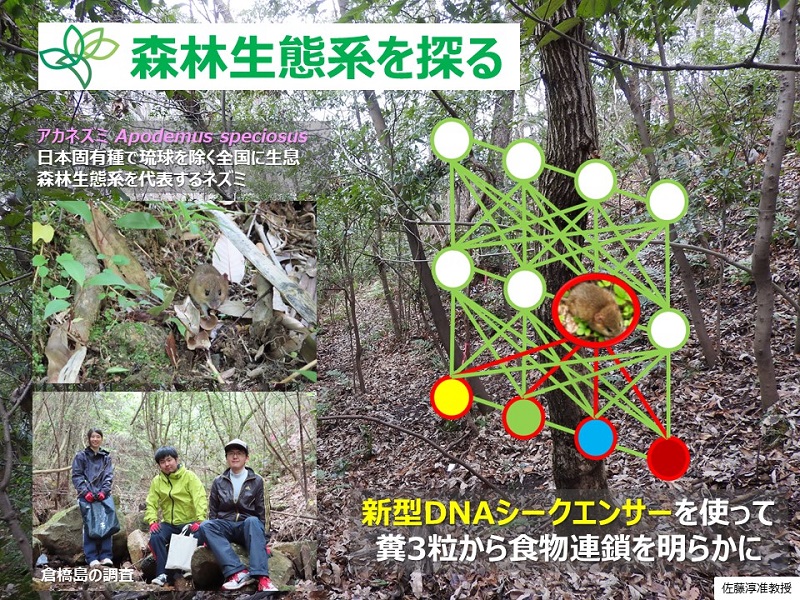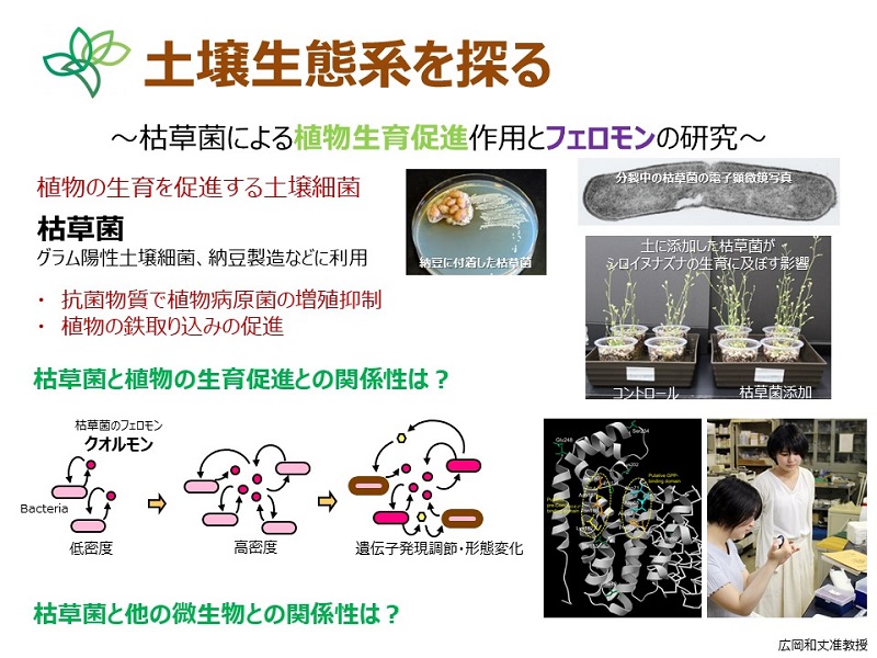 一方、DNAを分析する技術には革命が起こっています。これも微生物の力を利用したバイオテクノロジーのおかげなんです。たとえば、生物工学科では森に生きるネズミのウンチの中身をDNAで分析することで、生態系を解明する研究を行っています。次世代シークエンサーという新型のDNAシークエンサーを使うことで、たった3粒のウンチから動物が食べているものがわかり森の食物連鎖を明らかにすることができるのです。さらに、土の中で生きる枯草菌というバクテリアと植物との物質のやり取りを明らかにすることで、植物の生育を促進させる原因を明らかにしようとしています。また、フェロモンを使った微生物同士のコミュニケーション方法の解明にも取り組んでいます。