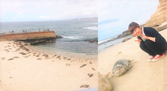 ラ・ホヤビーチでは驚くほどの野生のアザラシを見ることができ、一緒に写真を撮ることもできたんですよ!でも、あまり近づきすぎると、あざらしに低い声で威嚇されてしまうのでご注意を。私は小さい頃からゴマアザラシが好きだったので、一緒に写真が撮れてとても嬉しかったです。