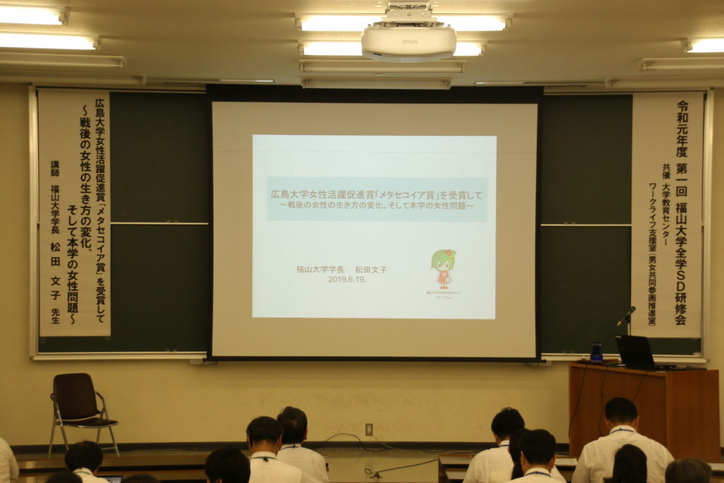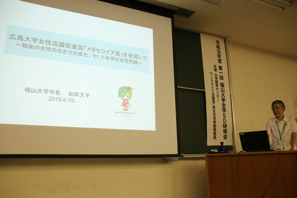 広島大学女性活躍促進賞「メタセコイア賞」を受賞した松田文子学長による令和元年度第1回大学教育センターのSD研修会が、ワークライフ支援室(男女共同参画推進室)研修会を兼ねて開催されました(6月19日(水))。