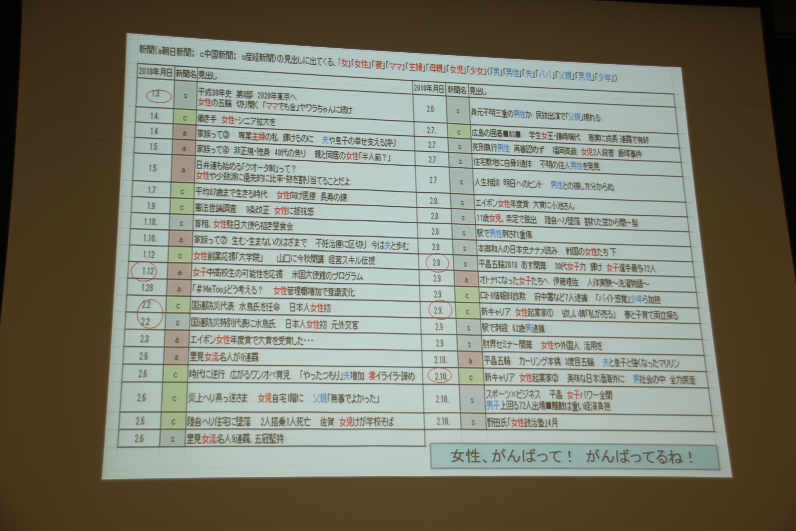 新聞3紙(朝日新聞・中国新聞・産経新聞)の見出しから女性と男性に関するワードに注目してみると、いかに女性が注目されているかがわかります。