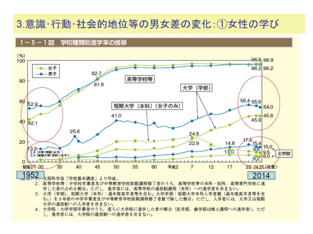 ここ20年あまりで女子短期大学への進学率が低調に(学部進学率は増加)