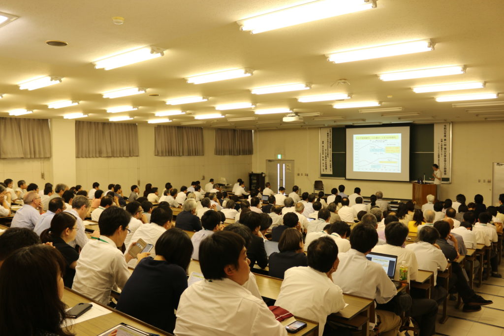 スマホやタブレットなども活用しながら大勢の教職員が熱心に聴き入っています