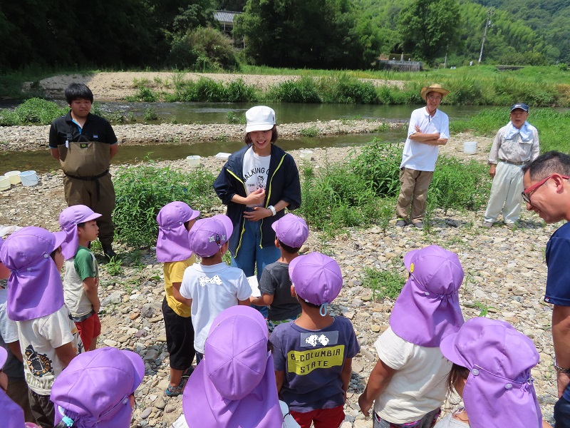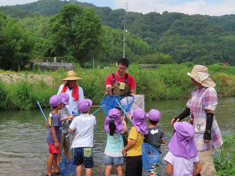 7月16日(火)に地元の西藤保育所のイベントの一つである藤井川での川遊びに参加させていただき、海洋生物科学科の真田誠至講師とその研究室で環境教育を学ぶ4年生が、学習のお手伝いをしました。保育所の子供たちと一緒に川の生き物を学びましたので、生物工学科の佐藤がお伝えします。
