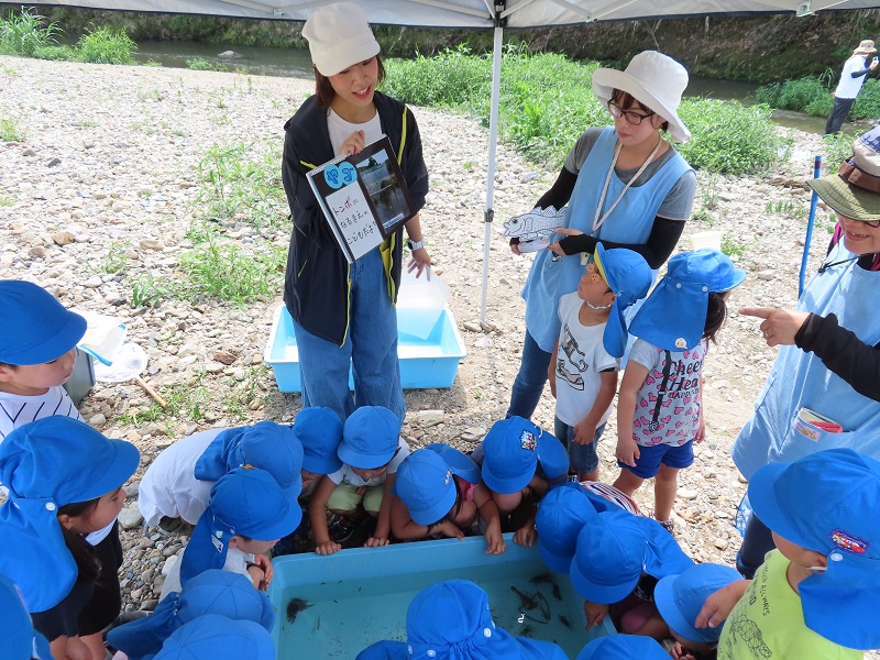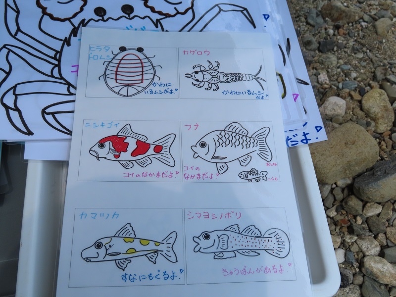 今年は川に入らない年中さん以下の子供たちは、タッチングプールで捕まえた生き物を観察しながら4年生による生き物の解説を聞きました。わかりやすい絵や写真を使って説明をしました。