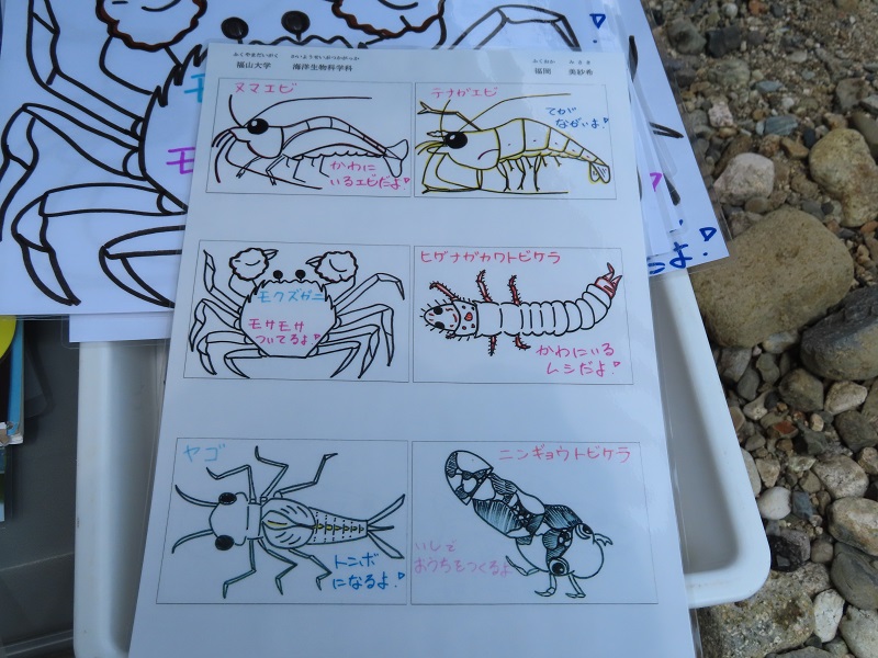 以下はその絵の一部です。最後は、年長さんにこの生き物を解説した絵をプレゼントしました。川にいる生き物をよく知って、川を守る意識が芽生えると嬉しいですね。川は森と海をつなぐとっても重要なところで、里山・里海学の根幹にあると言っても過言ではありません。