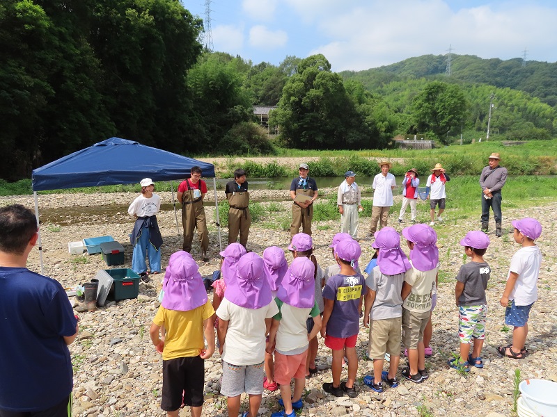 顔合わせ後は、早速4年生から川遊びの注意点と網を使った魚の捕まえ方の説明がありました。