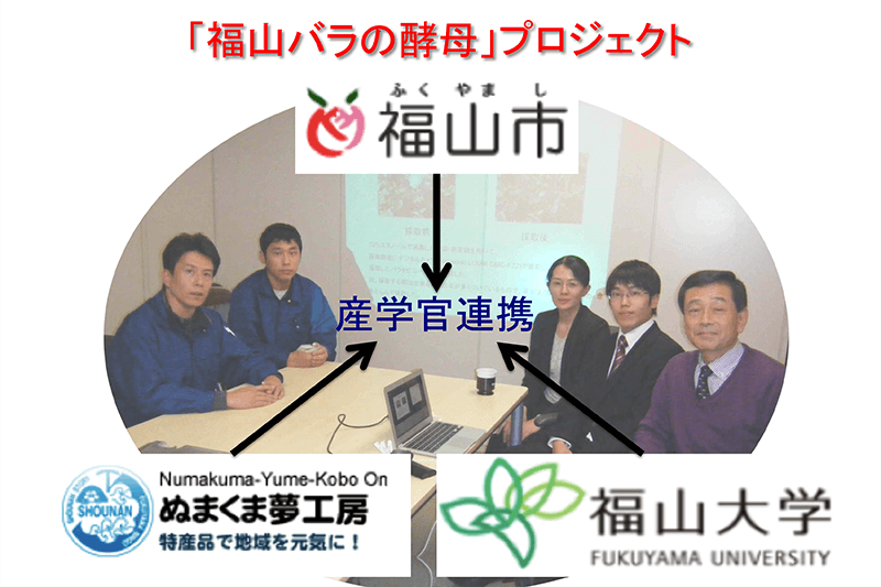 さて、生命工学部生物工学科の分子生物学研究室(久冨泰資教授)では、2013年から地域活性化を目指した産学官連携のプロジェクト(福山バラの酵母プロジェクト)を開始しました。これは、福山大学と福山市との包括協定の目玉の一つでもあります。