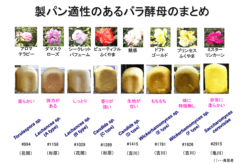 最終的にパン種に仕上げることができたのは、ミスターリンカーンという真紅のバラの品種から採取された野生の出芽酵母で、古来から発酵醸造に用いられてきたサッカロマイセス・セレビシエという酵母の仲間でした。食経験や安全性の面からも申し分ない酵母菌株です。