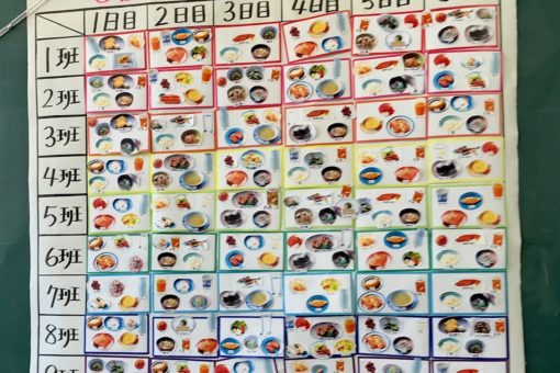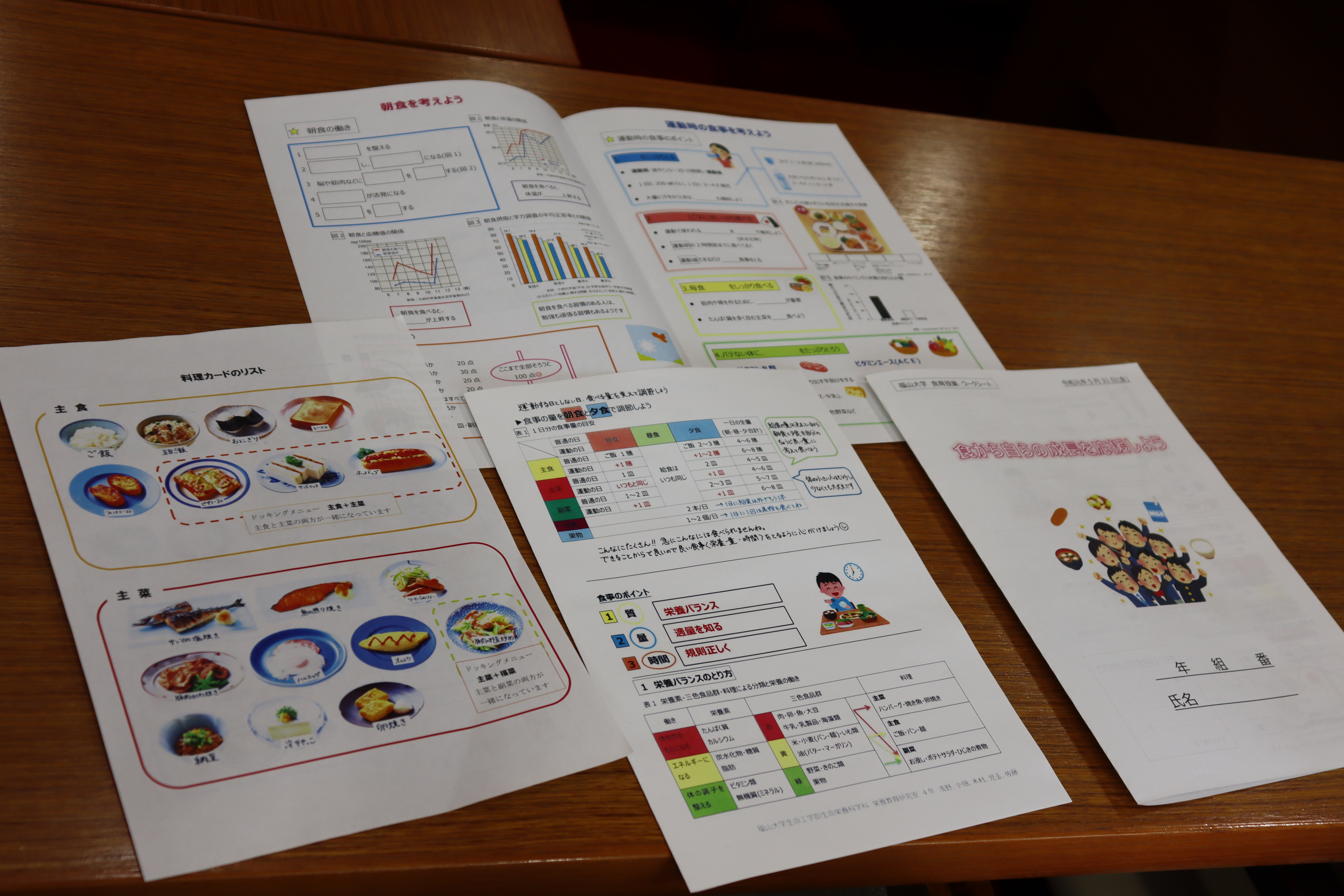 テーマは「食から自らの成長を応援しよう!」です。1回目は食事の質・量・時間について、科学的データを示しながら理解する授業を展開しました。2回目は実践編、主食・主菜・副菜・乳製品・果物などを組み合わせて朝食メニューを次々と考案していくグループワーク、班ごとに一番おすすめのメニュー紹介など大いに盛り上がり、あっという間に終了ベルがなりました。1クラスで54種類、全部で162種類の栄養バランス朝食メニューが完成し、クラス内に掲示されています。