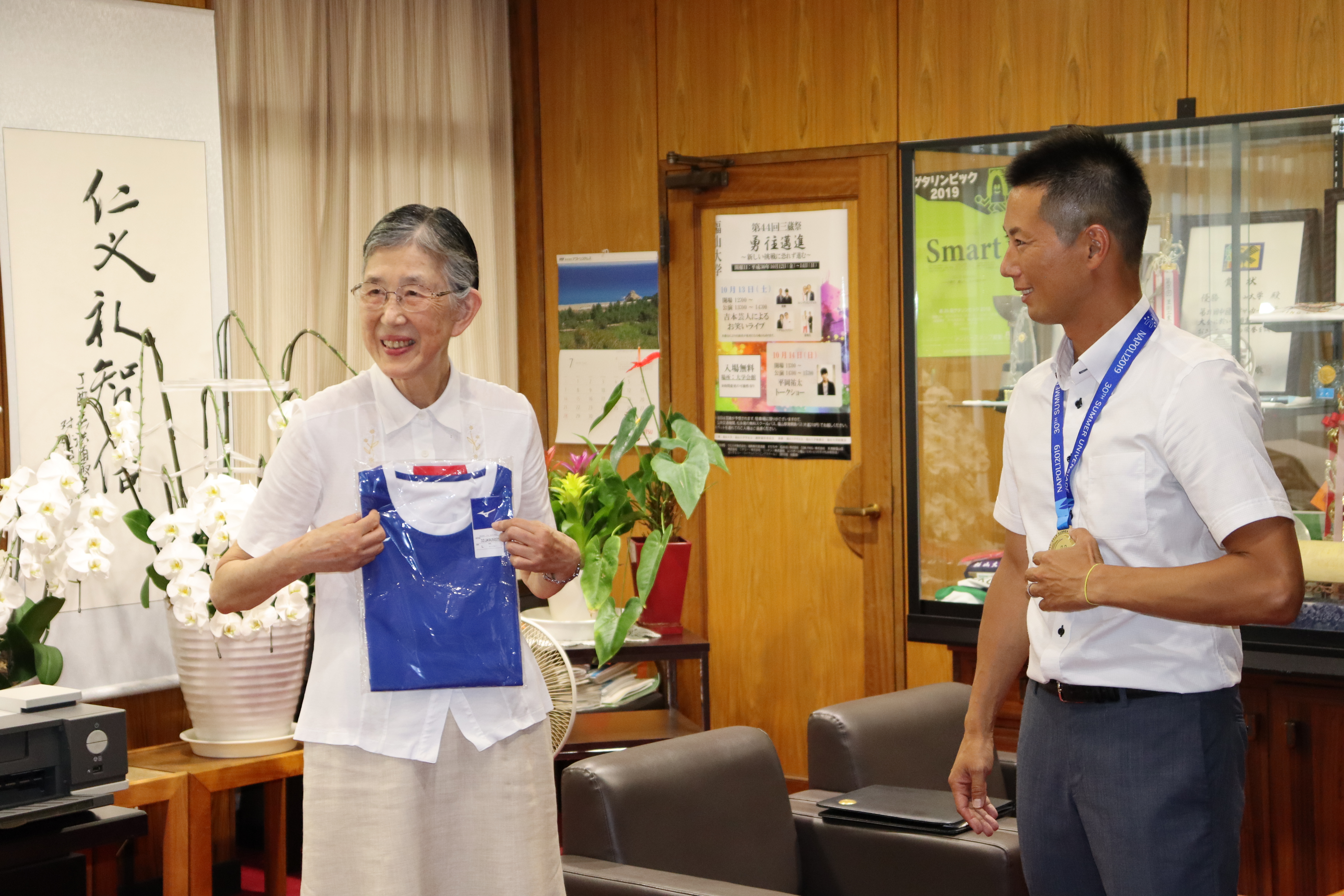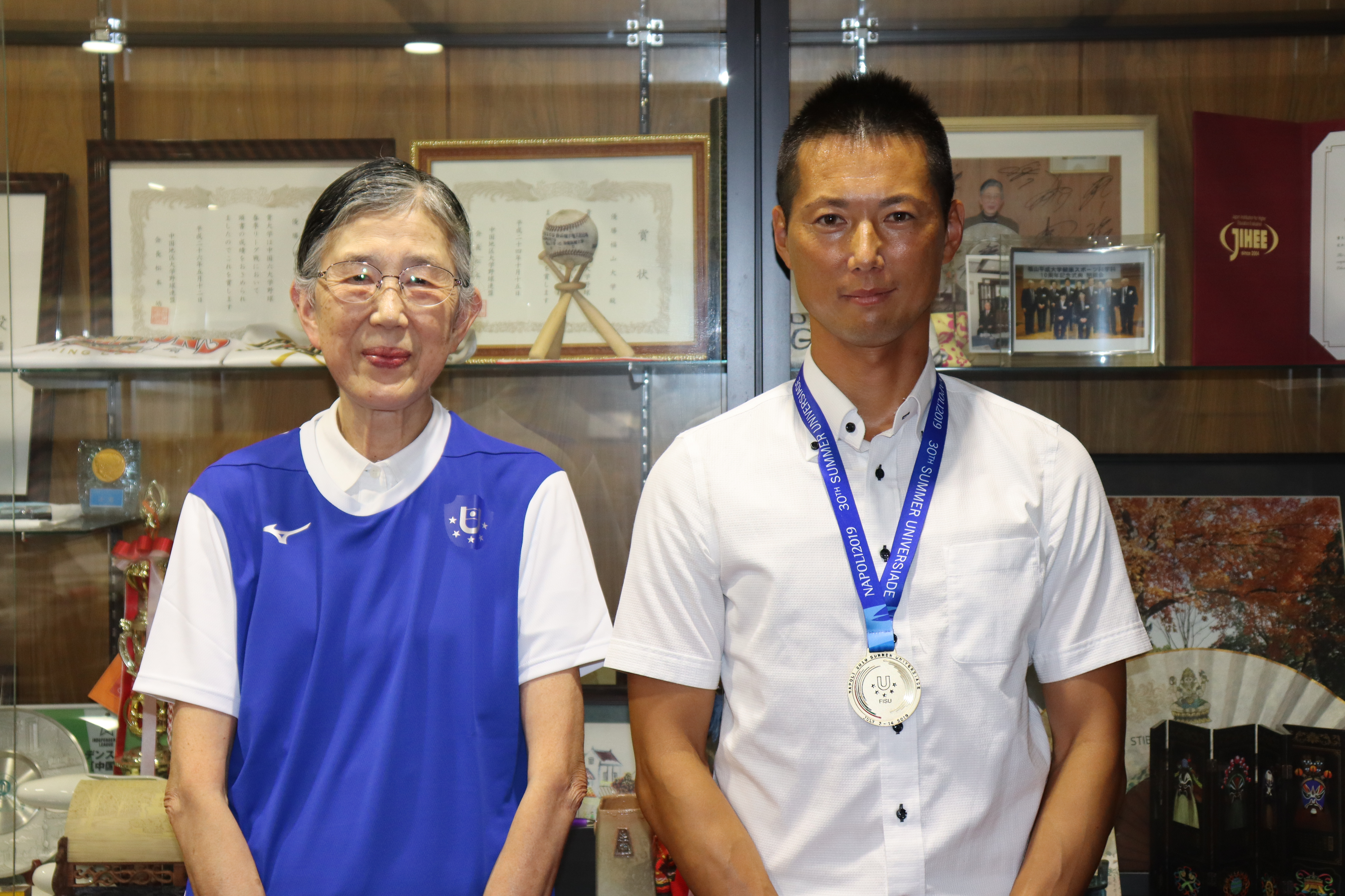 7月19日(金)、学長室へ大会成績の報告に来た的場監督の胸には、金色のメダルが輝いておりました!!!