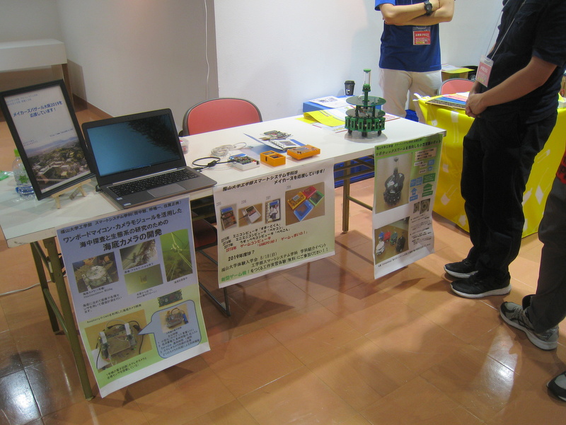 7月16日(火)のブログで予告したとおり、7月20日(土)~21日(日)の日程で、大阪南港アジア太平洋トレードセンター(ATC)ホールにて開催されましたデジタルものづくりの祭典「メイカーズバザール大阪2019」に参加してきました。このイベント出展の様子について、工学部スマートシステム学科(フェイスブックはこちら)の伍賀が報告します。今回は、スマートシステム学科としての出展の他に、福山大学工学部の「みらい工学プロジェクト」で学んだ実力を発揮した学生有志の皆さんが出展している姿もありました。スマートシステム学科では、これまでオープンキャンパスで行われる工作教室の教材として開発したミニコンピュータなどを出展してきました(昨年の様子)。今回の展示では、スマートシステム学科が積極的に展開している私立大学ブランディングプロジェクト「里海・里山プロジェクト」で開発している海底カメラの紹介、また私の研究室で取り組んでいる自律移動ロボットの展示、そしてこれまでのオープンキャンパス工作教室で製作したもの等の展示を行いました。