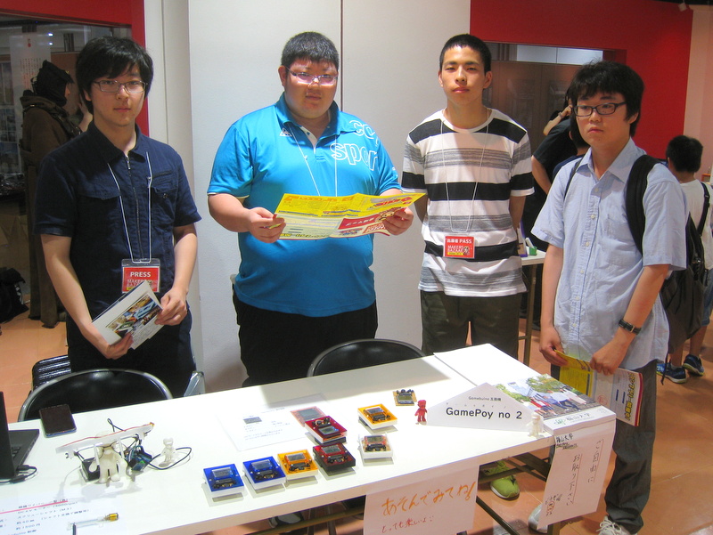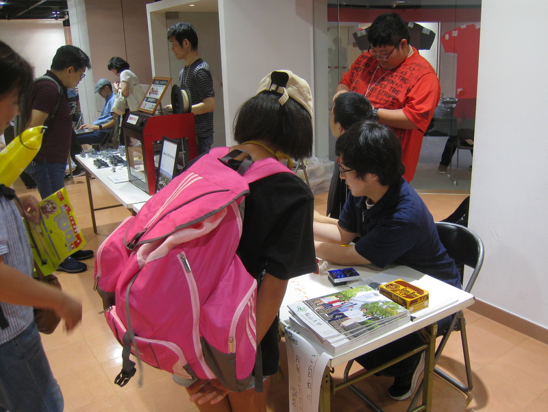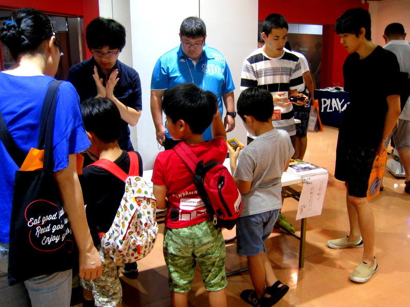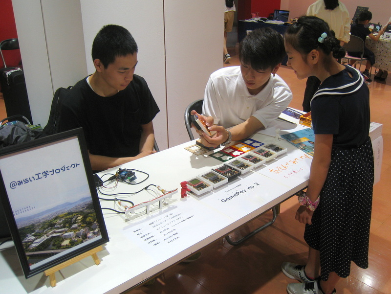 このイベントでは、夏休みに入ったばかりのお子さんを中心に多くの家族連れの方々が来場し、別の会場ではプログラミング教室やキッズクラフト教室、さらにロボットコンテストも開催され、理科教育・科学教育に関するお祭りの様相でした。学生ブースはゲーム機を中心に紹介していたこともあり、小学生から高校生・大学生までの方がひっきりなしに訪れてゲームに興じる姿が見られました。