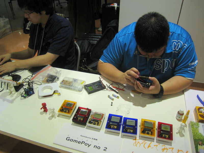 2日目に入っても、ますます盛況でした。学生のブースは、たくさんのゲーム機を用意してゲームを遊んでもらっていました。ゲーム機の耐久性も同時にテストできるので良い機会になったそうです。故障したり、不具合が出たものはその場で修理しました。また、ゲーム機もいろいろなカラーバリエーションを揃えて華やかにしていますね。