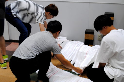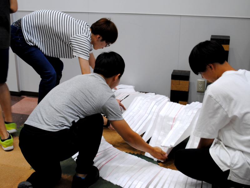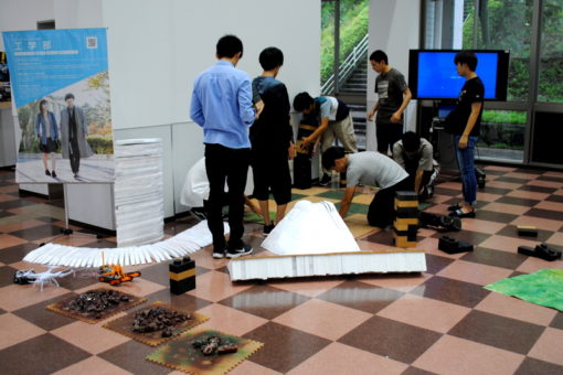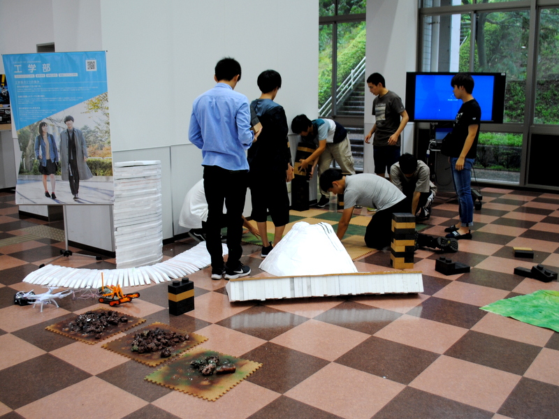 7月下旬の教養ゼミの15回目の講義で、成果発表会を行いました。実際にロボットを使ったシミュレーションを競技としてやってみよう!という試みです。発表会場は、工学部棟エントランスホールでプロジェクトルームで製作したものをエントランスホールに運び、設置していきます。土砂崩れのジオラマは、タテヨコ1.8m×1.8m で山間部での土砂崩れを表現したためにかなり高さもあります。また、紙粘土で土砂や岩石を製作しました。