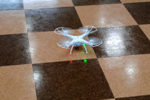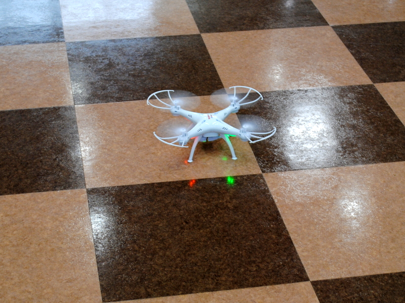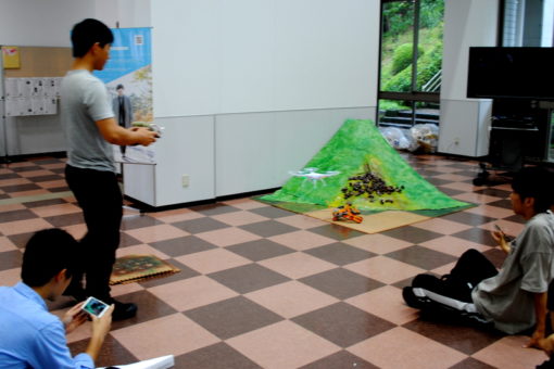 今回のシミュレーションの目玉であるドローンの登場です。小型のトイドローンと呼ばれる機体ですが、機体下部にカメラが装備されていてスマートフォンからこのカメラ映像がリアルタイムで見ることができます。1年生は、プロジェクトルームでこの機体を思い通り飛ばせるようにかなり練習をしていたようですね。