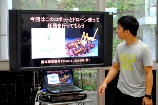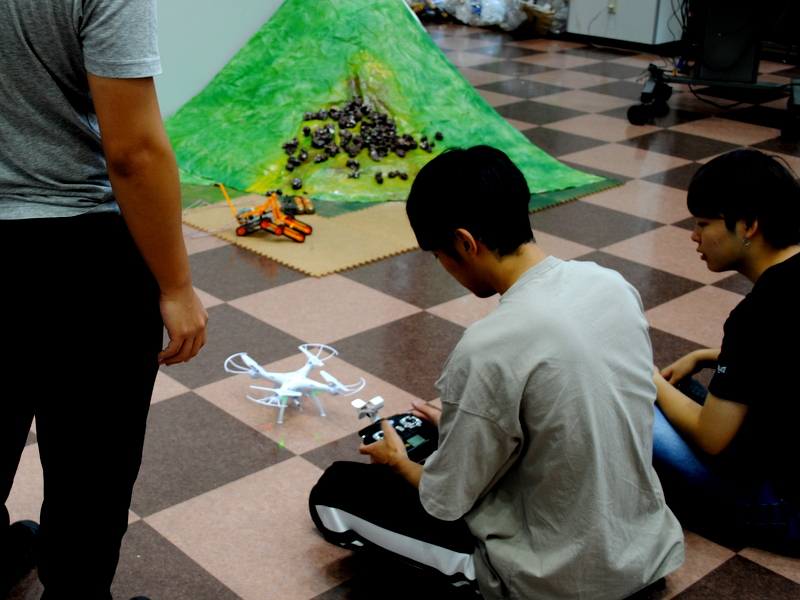 1年生による災害シミュレーションのプレゼンテーションです。ドローンを使ってジオラマの撮影や情報収集を行い、ドローン操縦者とロボット操縦者が協力しながら土砂災害エリアの探索と救助を行っていくという試行、競技形式です。