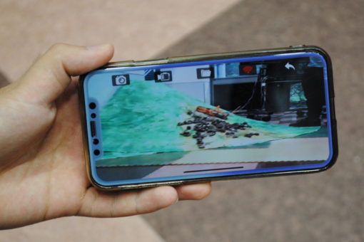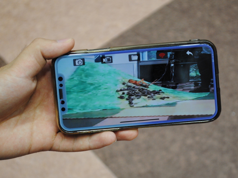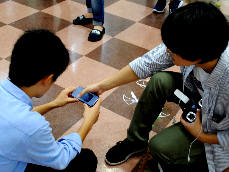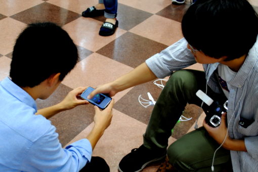 トイドローンからの映像を受信するために、スマートフォンの設定を行っています。学生の皆さんが持っているスマートフォンでも映像受信が可能なようです。映像の遅延や乱れもすくなく、とても綺麗な映像が見えるようです。