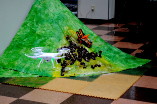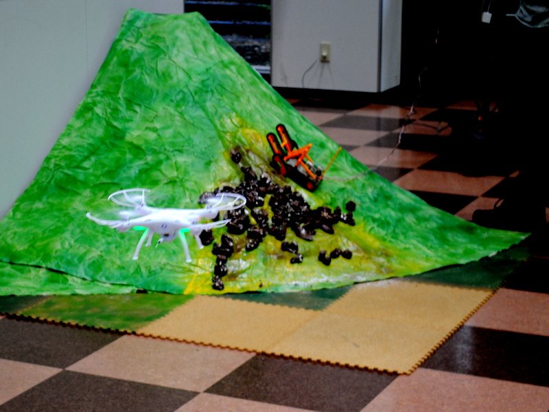 ジオラマを撮影するために浮遊するドローン。練習の成果が出ていて、ジオラマとレスキュークローラが良く見えるようにドローンを操縦することができています。レスキュークローラは有線で操縦しているので操縦者からもジオラマは見えているのですが、ドローンは別角度からの撮影をしています。