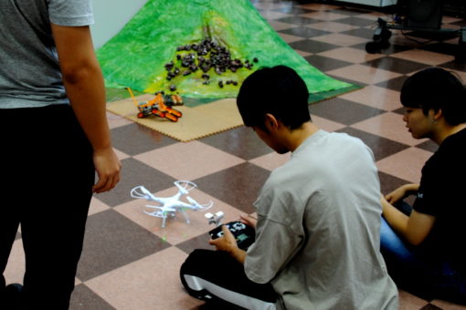 教養ゼミでのグループワークは、オリエンテーションや理数系リメディアル教育が終わった6月から開始され、最終授業で成果物の発表を行います。スマートシステム学科では、この数年、レスキュークローラというリモコン式ロボットキットを使用した災害救助ロボットシミュレーションに取り組んできました。グループワークのテーマは、受講学生のディスカッションとディベートによって決定してもらっています。今年度は、昨今様々な場面で注目を集めている「ドローン」による空撮を導入し、「地上のロボットとドローンの連携した災害救助シミュレーション」というテーマになりました。これは、昨年の広島・岡山を中心にこの地域でも大きな被害が出た西日本豪雨被害を踏まえて、本当に役に立つ技術とは何かを考えた結果です。