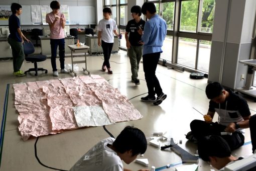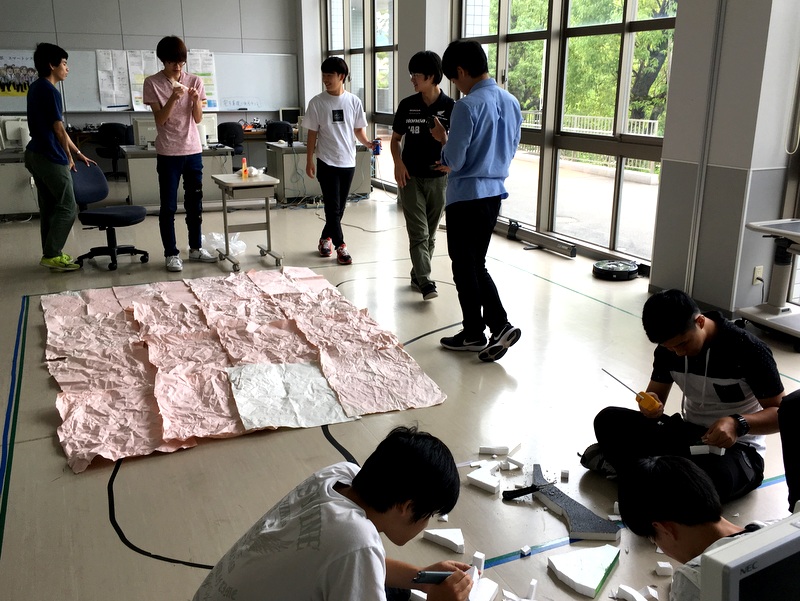 土砂崩れを模したジオラマを製作し、空からのドローンでの撮影による情報収集とその情報に基づき地上ロボットでの走破を行う、というなかなかチャレンジングなものになりました。まずは、ジオラマ製作のために、工学部棟1階のプロジェクト室で発泡スチロールやコルクボードなどの部材を手分けして加工していきます。