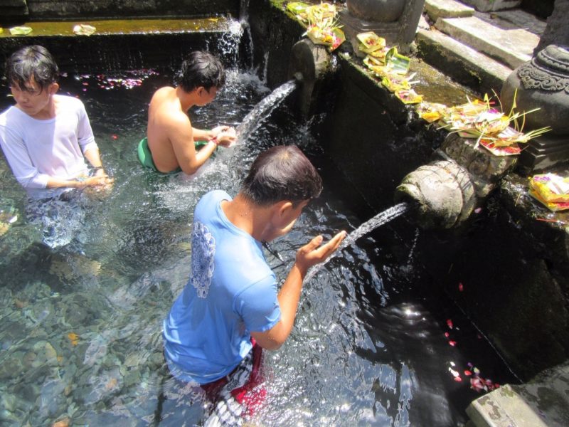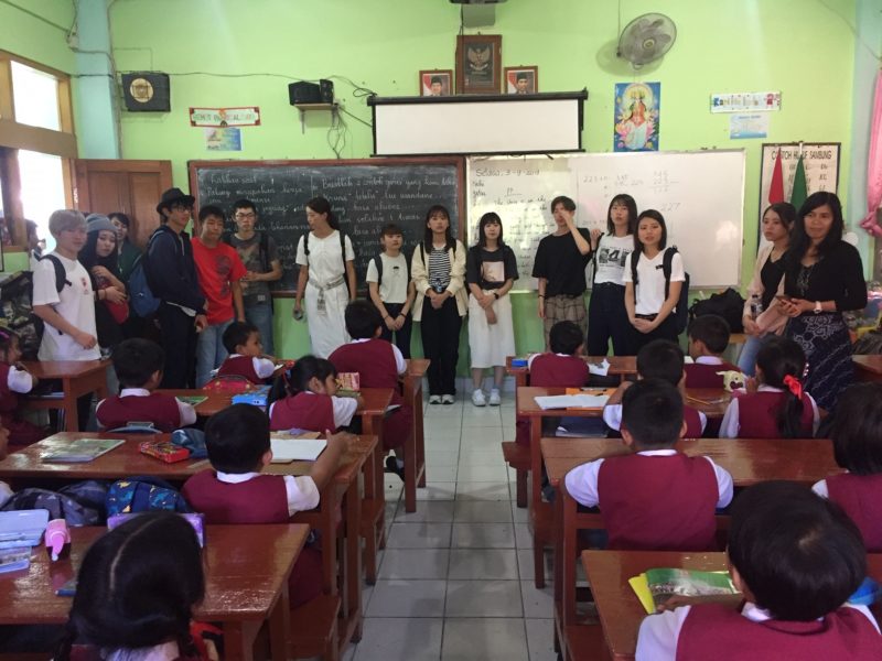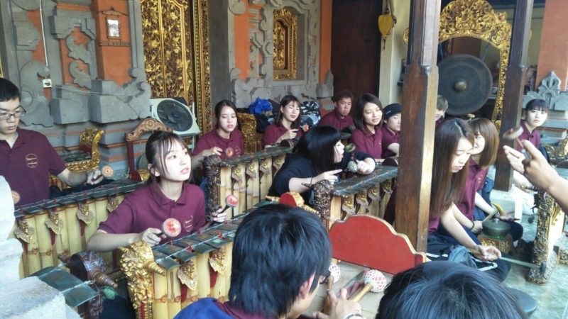 研修には、バリ島の文化や伝統に触れるスケジュールを組み込んでいます。バリ島の伝統的楽器であるガムランの演奏体験、ティルタウンプル寺院での沐浴、小学校訪問、バリ人の家庭を訪問するホームビジットなどです。演奏の難しいガムランですが、音感のいい若い学生たちはすぐに上手くなります。小学校訪問では、熱烈な歓迎を受けました。