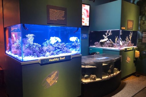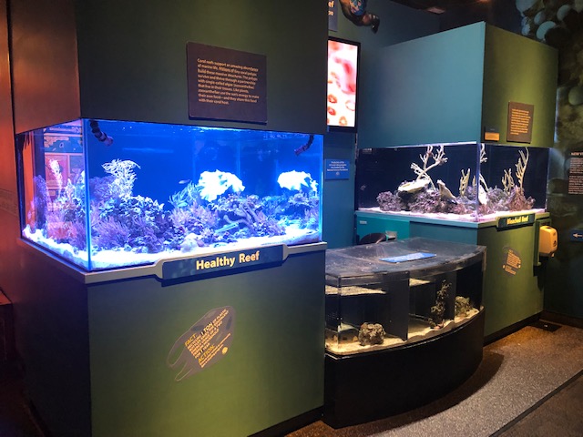 Healthy Coral、右奥がBleached Reefという2つの対照的な水槽