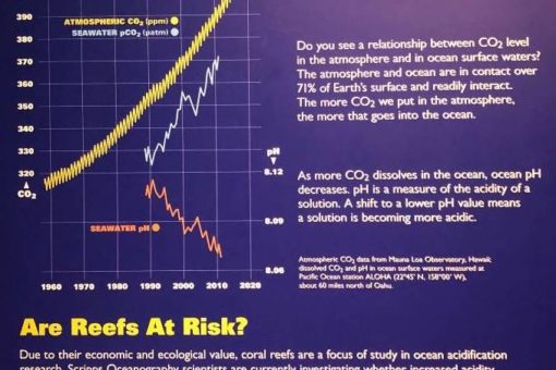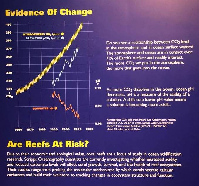 下の写真は、CO2が増加するとともにpHが低下して酸性になり、サンゴに悪影響をもたらす様子を示している展示パネルです。現在、スクリップス研究所では、試験的にパナマ海へ3種類のサンゴを植えて育てる研究をしているそうです。
