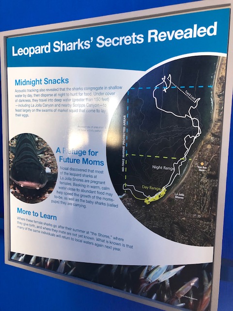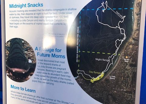 バーチ水族館が位置するラホヤは、主にLeopard Sharks の保護区域となっているため、ビーチでの釣りが禁止されています。サメは日中浅瀬に集まり、夜に分散してエサを探す習性があります。ビーチ付近の海はすぐに水深が深くなっており、ラホヤキャニオンとスクリップスキャニオンにサメが移動します。この付近の海はHealthy Coralではないものの、ジャイアントケルプが繁茂するため生態系が豊かです。サメにとっては温暖で穏やかな水域で生活ができるため、ラホヤの雌個体はほとんどが妊娠中だそうです。これらのサメは、成長後に産卵場所に戻ってくる習性があることが多くの研究結果から分かっています。