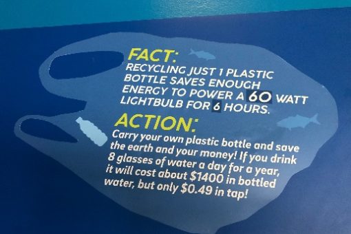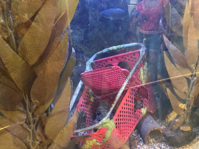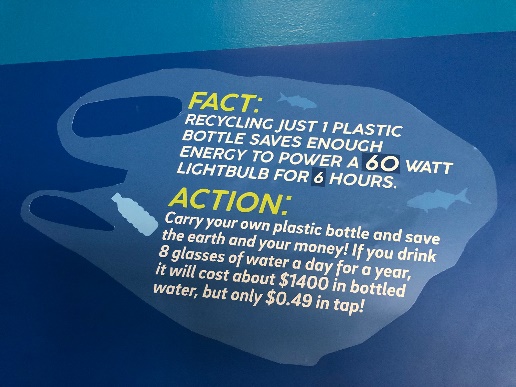 個人的には水族館内のいたるところに貼られているStickerに目が留まりました。ビニール袋のシルエットの中には「1個のペットボトルをリサイクルすると6時間、60ワットのエネルギーを節約することができる。ペットボトルを持ち歩くことで、1日8杯の水を飲むときに必要なコスト1400ドルを水道代だけの0.49ドルにすることができる。」と書いてありました。カリフォルニアは水の値段が高いということもありますが、マイボトルを持つことがペットボトルの量を減らすことにつながっていると思いました。他にもプラスチックごみがどのように魚たちに影響するか?など多くのことが書いてあり、このようなStickerは日本ではあまり見たことがありません。立ち止まってじっくり読むような長文ではないので、非常に読みやすく、これもまた訪れる人々に環境を意識させるきっかけになっていると感じました。