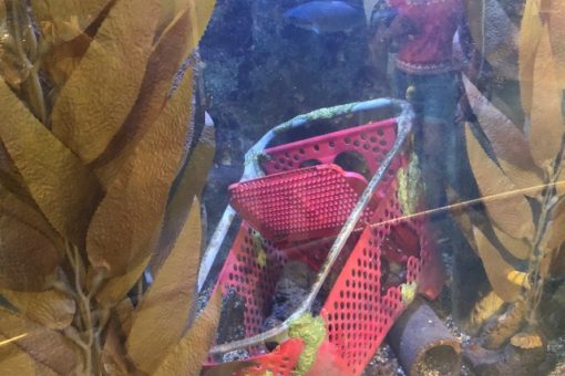 朽ち果てたショッピングカートが沈んでいるジャイアントケルプの水槽