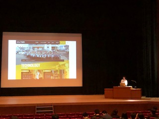 1部は、参加企業の50社に各1分間の企業紹介を大学会館ホールで行っていただきました。学生が興味を引くキーワードや画像を用いて、企業名や説明文だけでは分からない会社のことをイメージしやすく説明いただきました。