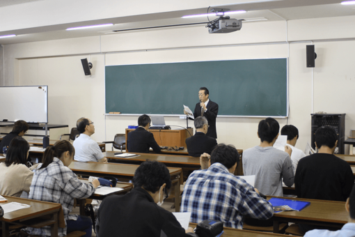「お酒の講座」は広島国税局の企画で、講師の選定や日程なども調整いただきました。講義では、まず広島国税局の酒類調整官から本企画の趣旨などが説明されました。また、来春に広島県先行上映予定の吟醸酒の父・三浦仙三郎(東広島市出身)を描いた映画「吟ずる者たち」が製作中との紹介もありました。