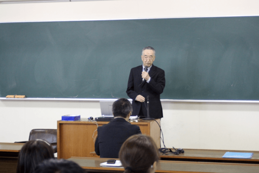 学長から一言:ブドウの栽培からワインづくりまでを授業に組み込んでいる生物工学科ならではの講義ですねッ!この「お酒の講座」が広島国税局の企画で、講義ではまず広島国税局の酒類調整官のお話から始まり、そしてそのあと老舗の酒屋さん二代からの講義というのも、硬軟織り込んで、という感じで粋ですねッ!