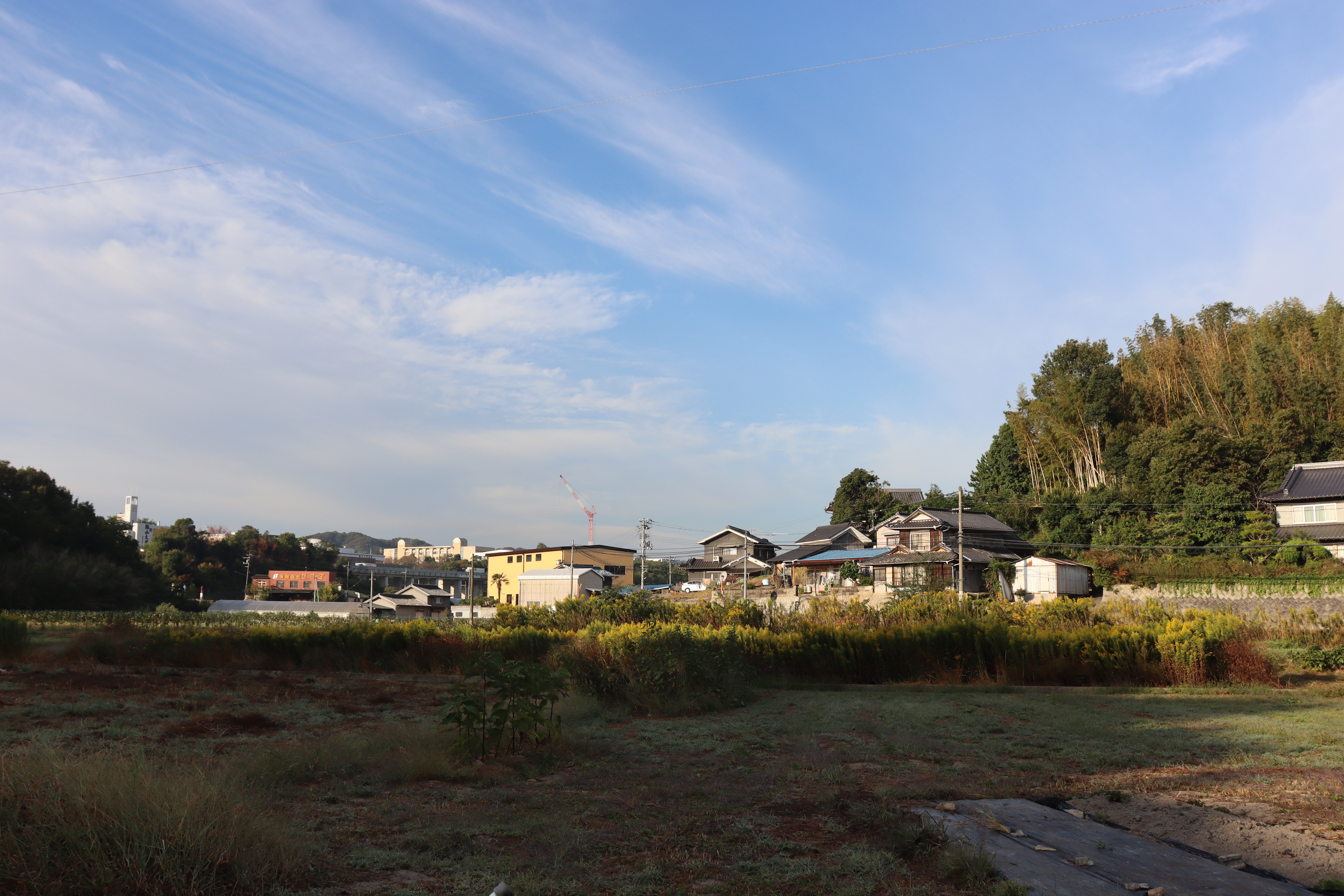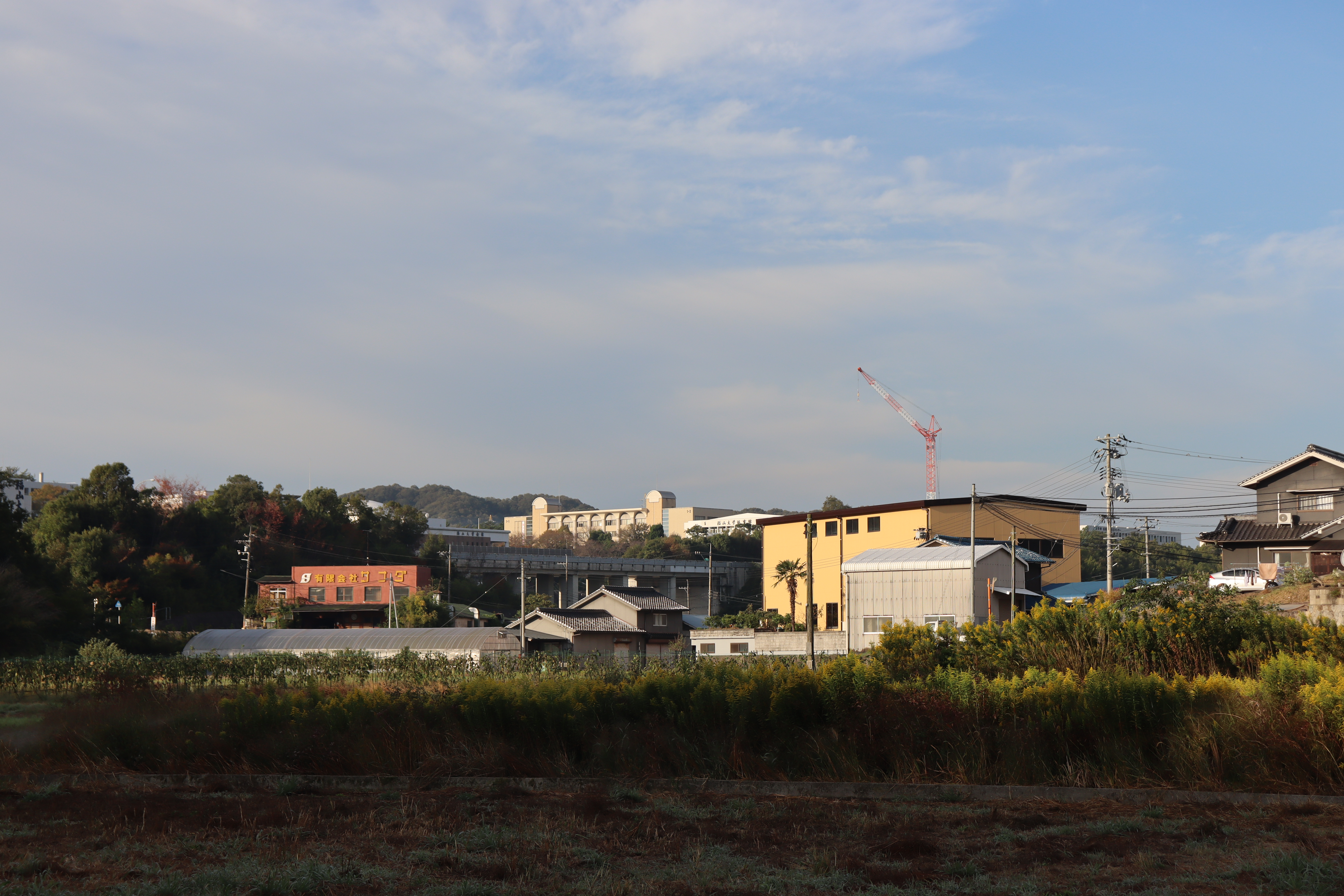 福山大学へ向かう一般道から見える大きなクレーンです。緩やかな自然の中では一際目立ちますね。