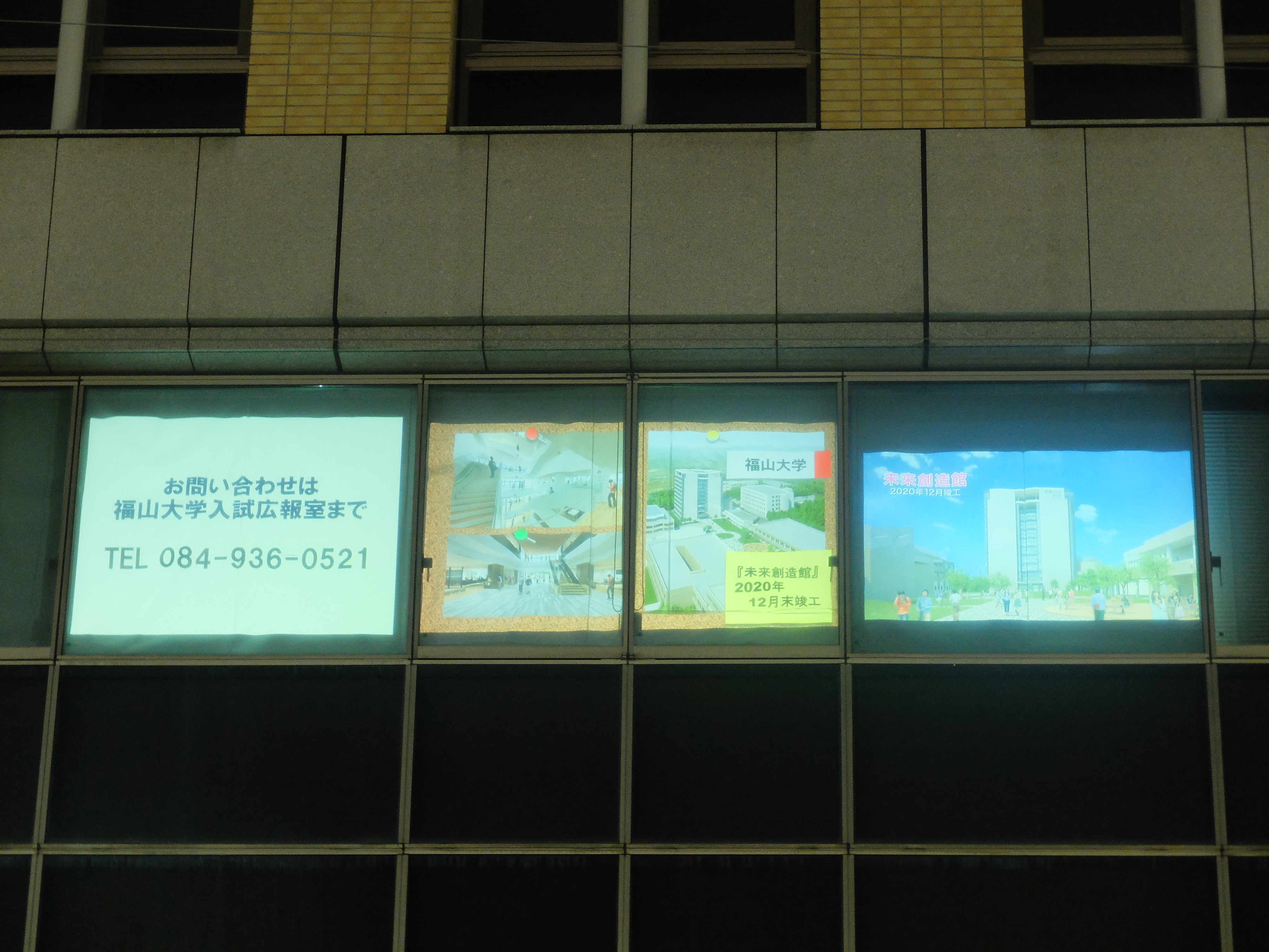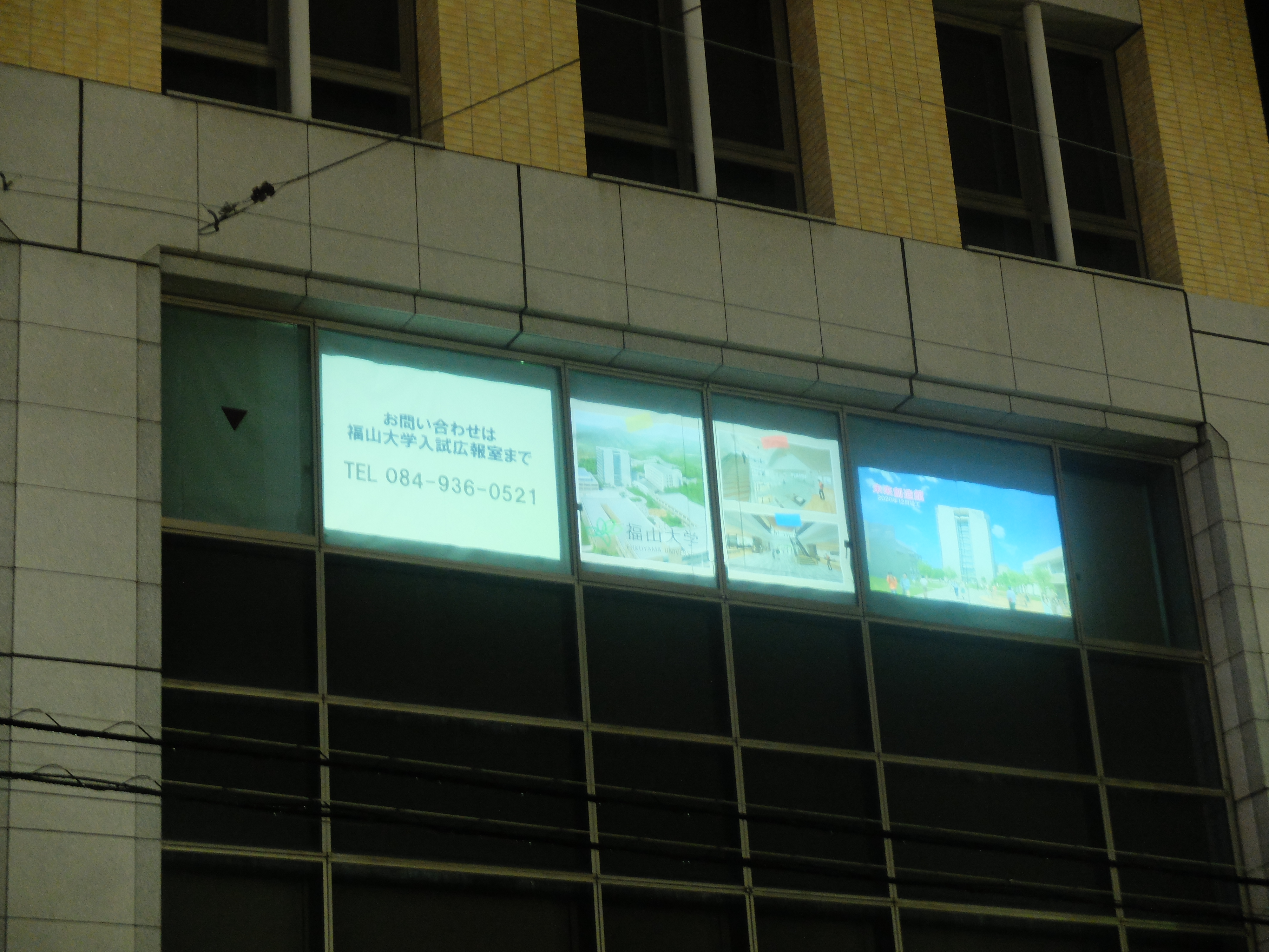 3階の窓から放映されているので地上からは見上げるようになりますが、観光バスの乗降者などJR福山駅の北口をご利用される方の目に留まると思います。