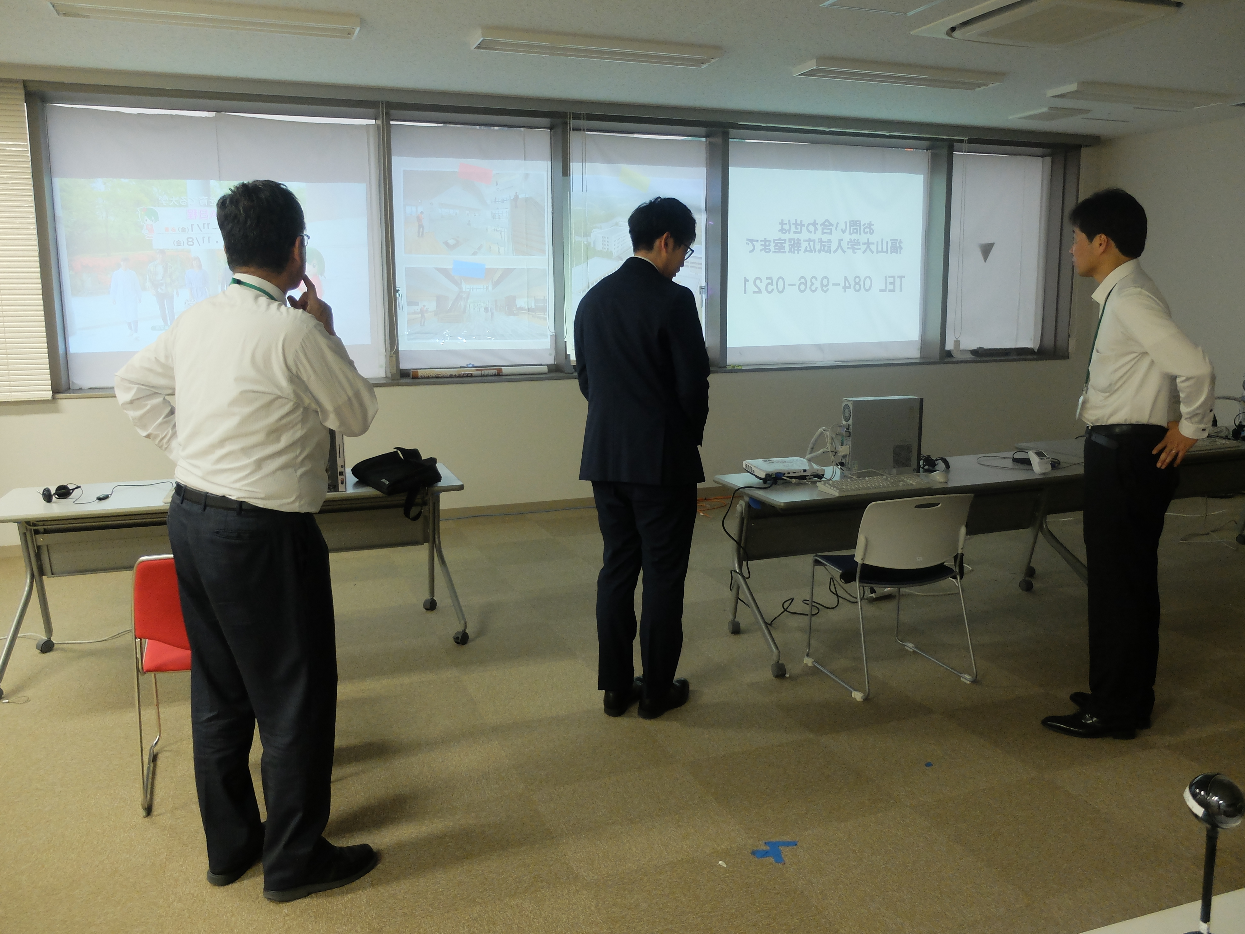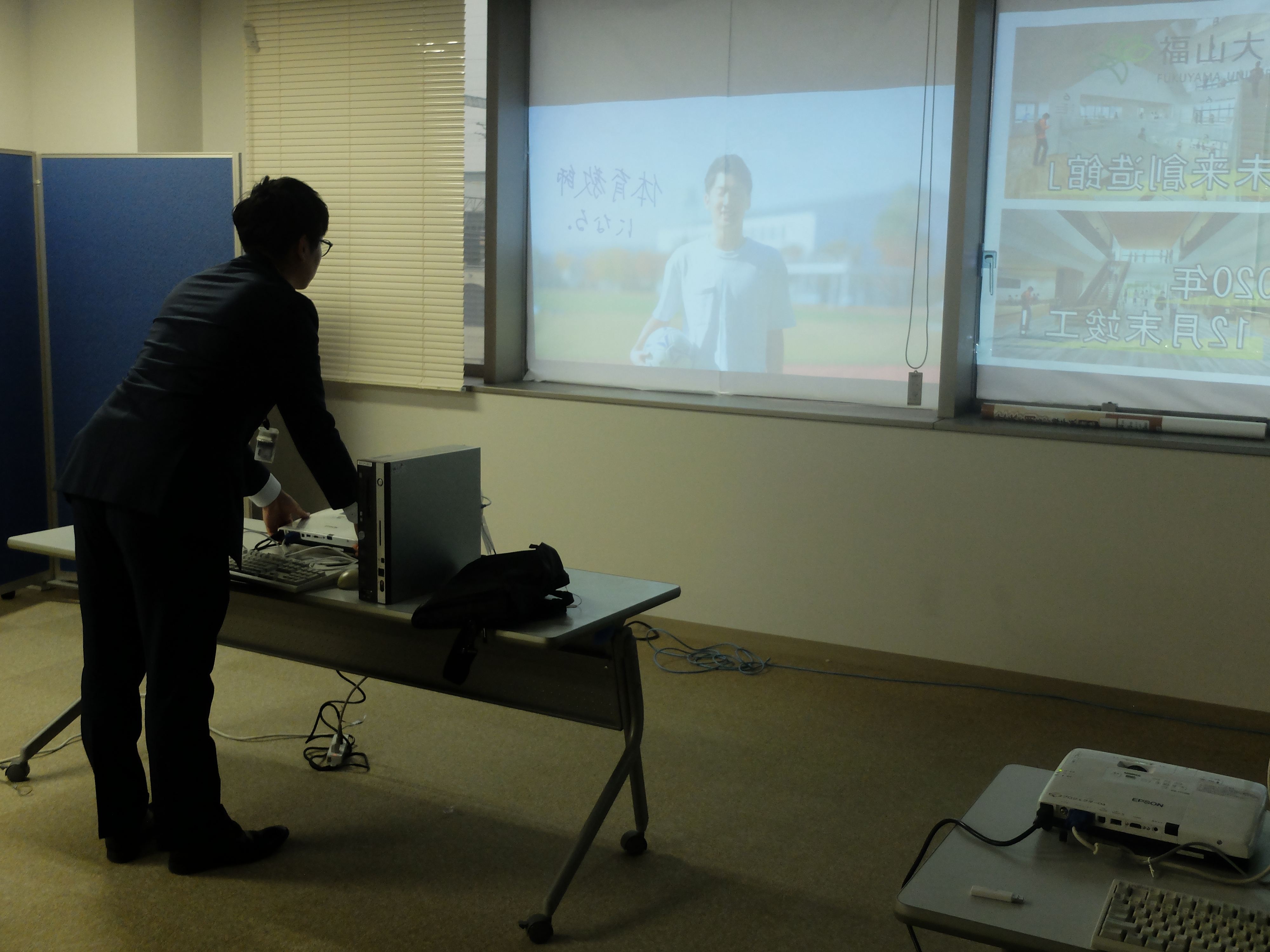 学長から一言:情報工学科とメディア・映像学科が協力して開発した、この安価で魅力的な宣伝媒体は、福山城築城400年記念事業で制作された福山城CGと福山城についての解説映像「よみがえる福山城」が終わった後は、しっかり福山大学・福山平成大学の宣伝に活用しますよ!皆さん、ぜひ見てくださいねッ!!!