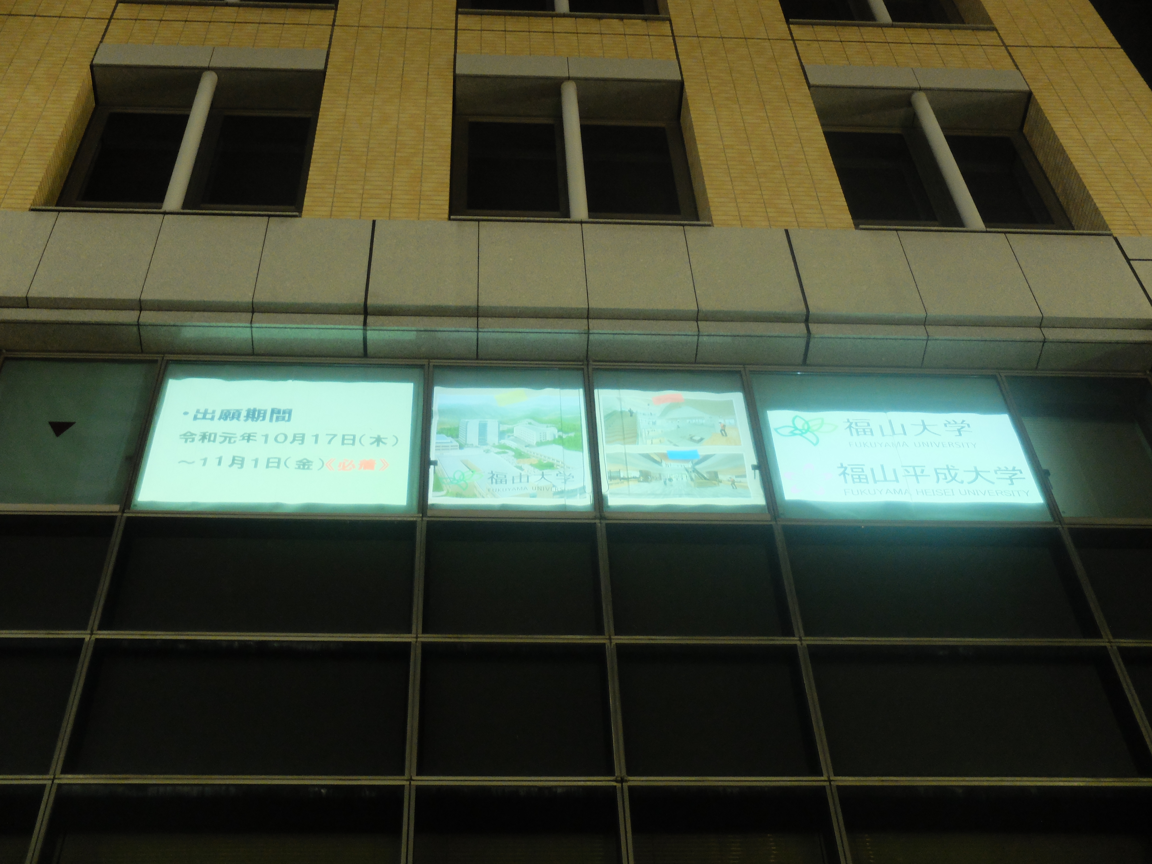 福山大学及び福山平成大学の推薦入試A日程出願開始日である10月17日(木)より、JR福山駅前の学校法人福山大学宮地茂記念館にて、両大学に関する情報の発信を行っています。(企画・文書課投稿)
