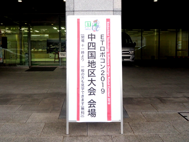 今年度のETロボコン2019中四国大会では、中四国地方の大学、高専、専門学校、企業から19チームがエントリーし、全国大会であるチャンピオンシップ大会への出場を賭けて競技を行います。デベロッパ部門では、コースに描かれた黒線に沿うライントレースで、途中シーソーやゲート潜りなどの障害物を乗り越えながらタイムを競います。右側コース、左側コースで2チームが同時にスタートし、左右のコースを入れ替えて2度の競技を行います。今年の中四国大会に出場しているチームは、いずれも理工系やものづくりで有名な組織ばかりでした。果たして、この激戦区を勝ち抜けるでしょうか・・・・。